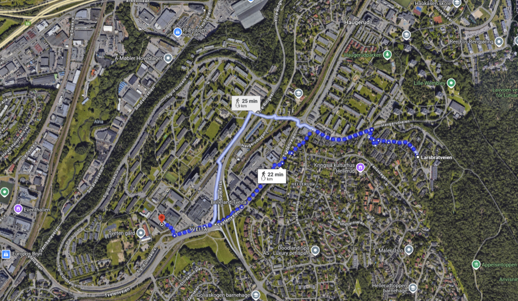 Illustrasjon 1: Gangavstand langs Tvetenveien fra Tveita skole til Larsbråten-området på Haugerud. Tilsvarende avstand til områder i Haugerudhagan og blokkene i Haugerud borettslag.