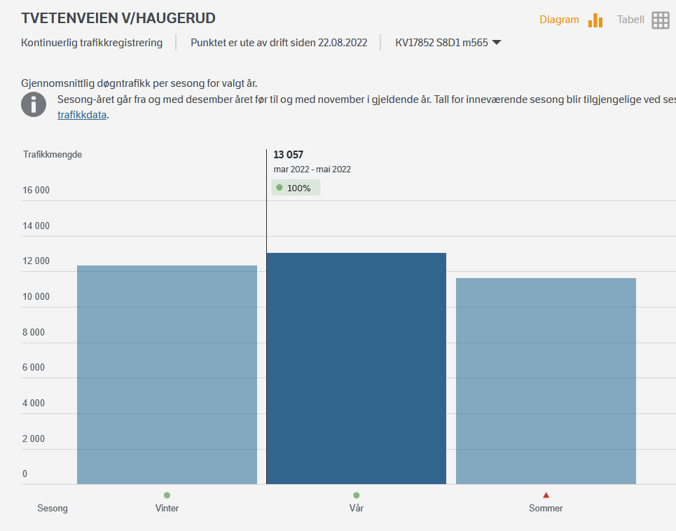 Illustrasjon 2: Døgntrafikk per sesong for Tvetenveien ved Trosterud skole. Veien er svært trafikkert, og hadde 13057 i døgntrafikk i den mest travle sesongen.